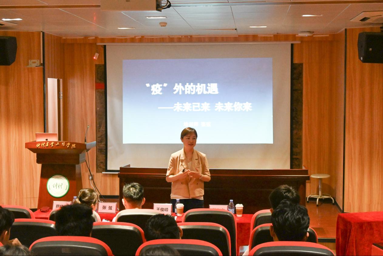 会上,张弦老师就中国现代经济发展趋势,以及结合疫情要素,总结提炼了当今全国高校大学生创新创业发展的现状以及推测以后的趋势。她指出,如今大学生创业现状主要存在项目创业选择困难、创业成本高、经验不足、理论大于实践四个重要痛点。同时她强调,大学生创业的特点是创业的洞察力、创业思考、项目期许以及系统思维四个部分,而大学生创业机遇便是自身素质、能力和资源的结合。