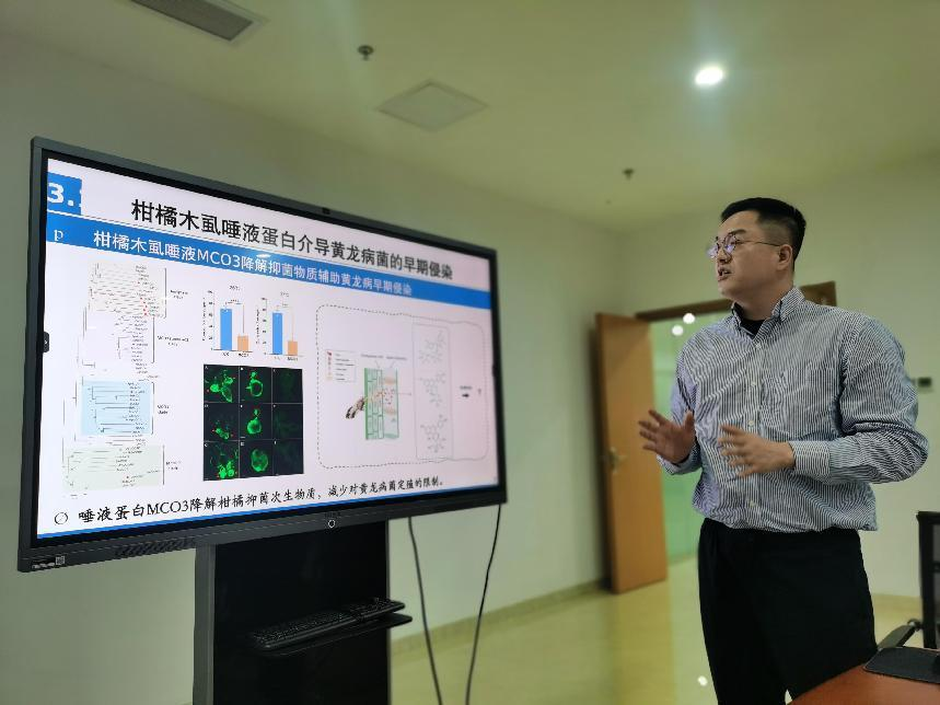 黄江华院长介绍了本次调研的目的和学校的基本情况。他表示,深圳农业科技促进会为深圳的农业农村发展、乡村振兴做出了积极贡献,在此过程中“绿之源”等校企合作品牌企业发挥了重要作用;yl23455永利将发挥科研、技术优势,全力以赴支持深圳市农业科技的发展,用科技助力深圳农业农村发展。他衷心希望农业高校、地方科研机构、企业等单位要加强资源整合,共同助推农业技术创新发展,为中国乡村振兴做出应有贡献。接着,吴仲真副教授介绍了学校近年来取得的技术成果和科研进展情况,同时在柑橘黄龙病的快速检测、“三棵菜”主要病虫害绿色防控等领域做了详细的讲述并与中心进行了深入交流。
