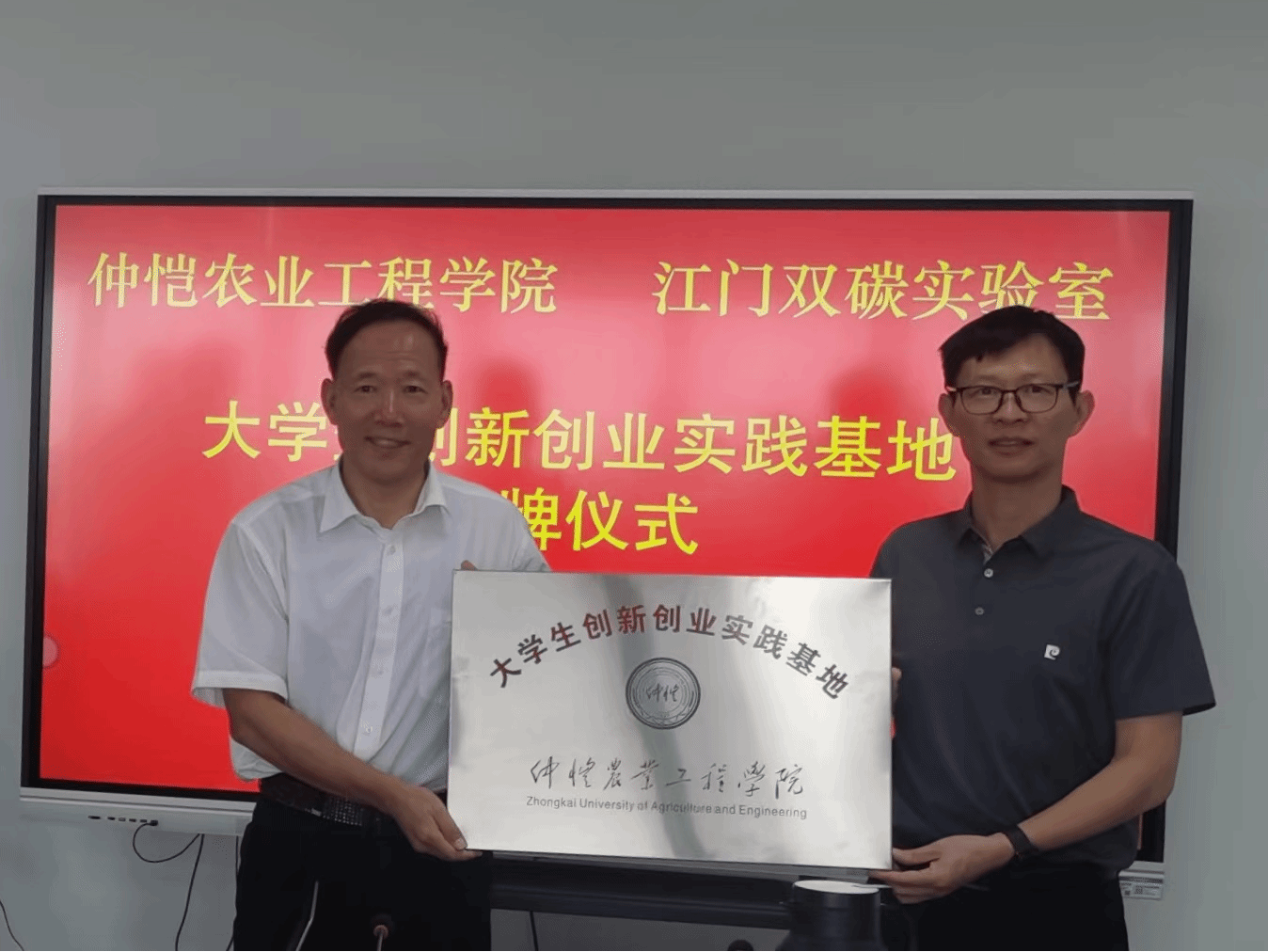 在江门双碳实验室,朱立学一行首先参观了双碳实验室展厅、双碳产业园、双碳农作物实验田等地,了解了江门双碳实验室在硅能源电力系统、新型储能技术、碳计量与碳资源利用、碳捕集利用与封存、双碳政策与系统设计五个领域的创新成果和前沿技术。双方座谈交流会上,江门双碳实验室常务副主任徐明对我校一行的到访表示热烈欢迎,并介绍了双碳实验室的成立背景、职能定位、运作机制和未来规划等,详细介绍了实验室的双碳技术在农产品增产提质、促进农业农村发展与高校产学研合作等方面所取得的重要成果。朱立学介绍了学校的发展历程、学科建设、专业设置、人才培养以及校企合作等情况,并希望今后双方能够在校企科技创新、碳产品品牌建设及流通、人才培养和社会服务等方面加强合作共建。随后双方进行了深入的合作洽谈,并进行大学生创新创业实践基地授牌。