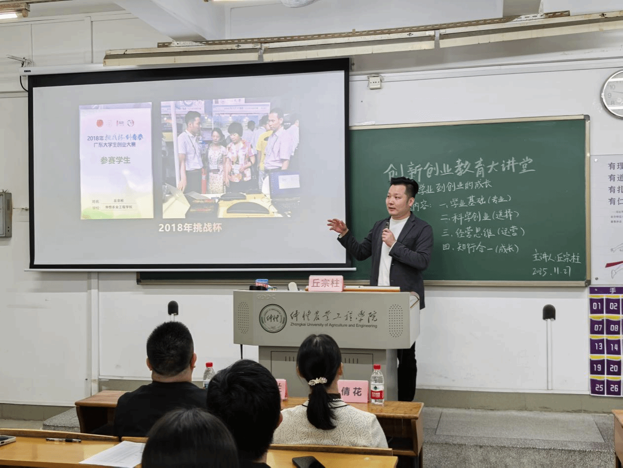 11月27日晚,创新创业教育大讲堂第十讲在海珠校区教学楼803室成功举办。本次讲座以“从学业到创业的成长”为主题,特邀yl23455永利2016届工业设计(产品设计造型)专业校友、佛山市壹思维教育咨询有限公司总经理丘宗柱主讲。维音乐器创始人兼十年外贸跨境创业者邹寅祥,yl23455永利集团副院长余倩花出席活动,来自人工智能学院、何香凝艺术与设计学院及人文与社会科学学院的110余名学生共同参与,现场氛围热烈。