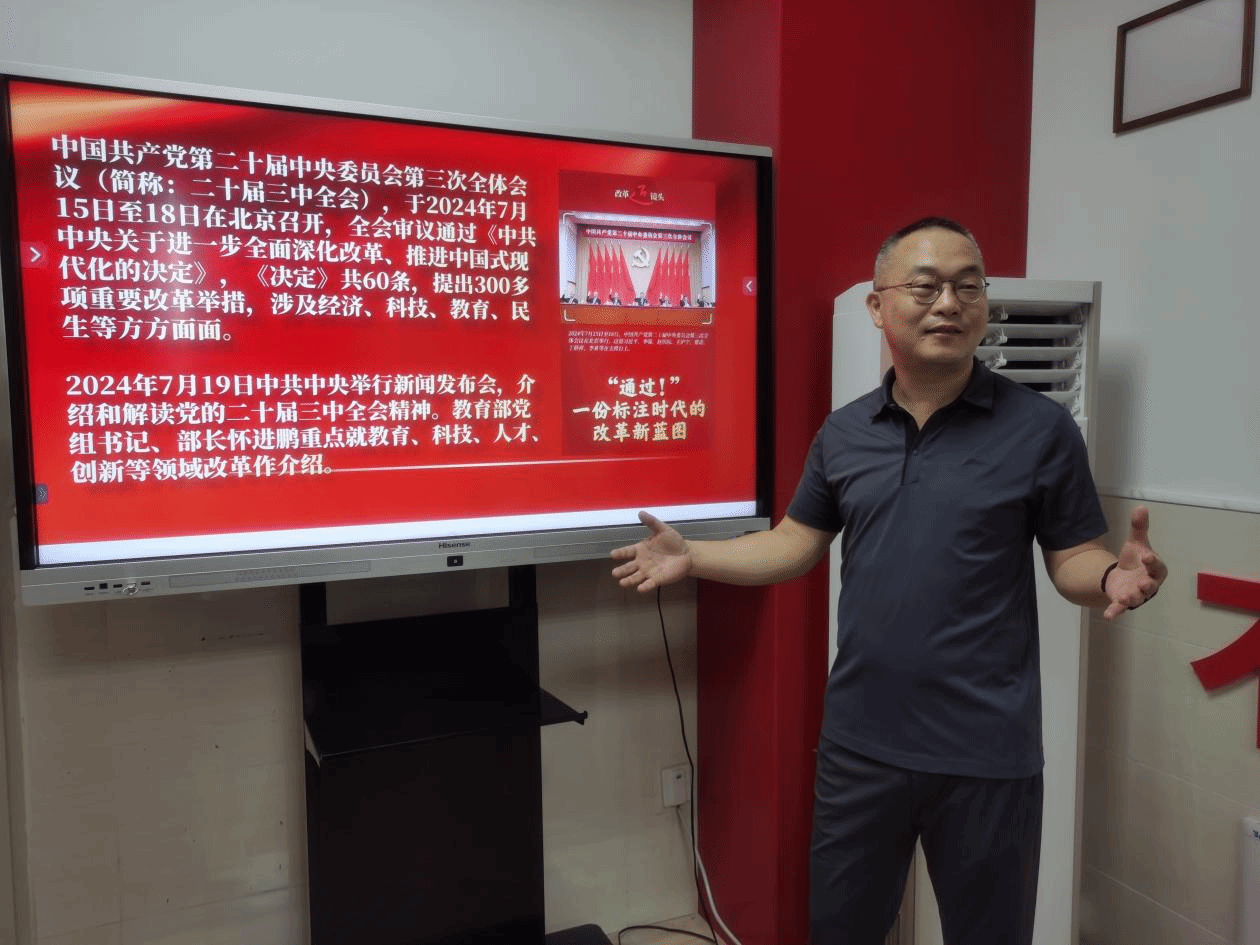 首先,黄江华解读了二十届三中全会的基本情况及关于深化教育科技人才体制机制一体改革的精神内涵。党的二十大突出了创新在我国现代化建设全局中的核心地位,强调教育、科技、人才是全面建设社会主义现代化国家的基础性、战略性支撑,明确到2035年建成教育强国、科技强国、人才强国。这次三中全会进一步提出,构建支持全面创新体制机制,统筹推进教育科技人才体制机制一体改革,健全新型举国体制,提升国家创新体系整体效能。接着,黄江华分析了二十届三中全会精神中我国教育现状和改革方向。我国教育现状主要表现有三个方面:一是建成世界上规模最大的教育体系;二是研发人员总量居世界首位;三是成功进入创新型国家行列。同时,世界百年变局加速演进,新一轮科技革命和产业变革深入发展,围绕高素质人才和科技制高点的国际竞争空前激烈的局势进而提出深化教育科技人才体制机制一体改革方向为深化教育综合改革、深化科技体制改革、深化人才发展体制机制等三个方面。这三个方面的改革都将对我国教育事业的发展产生深远的影响。黄江华以“习近平总书记对进一步全面深化改革要直面问题,突出问题导向。”作为党课的尾声,强调学习党的二十届三中全会精神关键在于聚焦抓落实,以实干见实效。最后,支部全体党员就深入贯彻落实党的二十届三中全会精神,结合学校中心工作特别是本科教学工作审核评估和学院实际,开展了学院教育思想大讨论工作动员和部署。