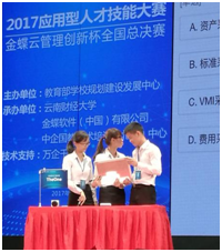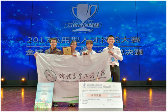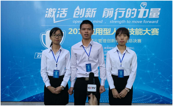 该项赛事自今年6月份启动以来,全国300所高校1210支队伍参赛,分为12个省区赛,其中88支队伍晋级全国总决赛,最后分为本科组和高职组各争夺1个一等奖。总决赛由中央电视台全程跟踪报道。我校信息科学与技术学院许佳琳、何燕芳、崔健武三位同学在指导老师黄灏然副教授的指导下,过关斩将,以赛区总分第一晋级全国总决赛。在全国总决赛中,学校代表队通过团队协作以及扎实的理论基础和过硬的实操技能,以决赛总分第一斩获大赛本科组一等奖。金蝶软件公司在颁奖现场直接向三位获奖同学伸出橄榄枝,毕业后可直接获得金蝶软件公司工作机会。