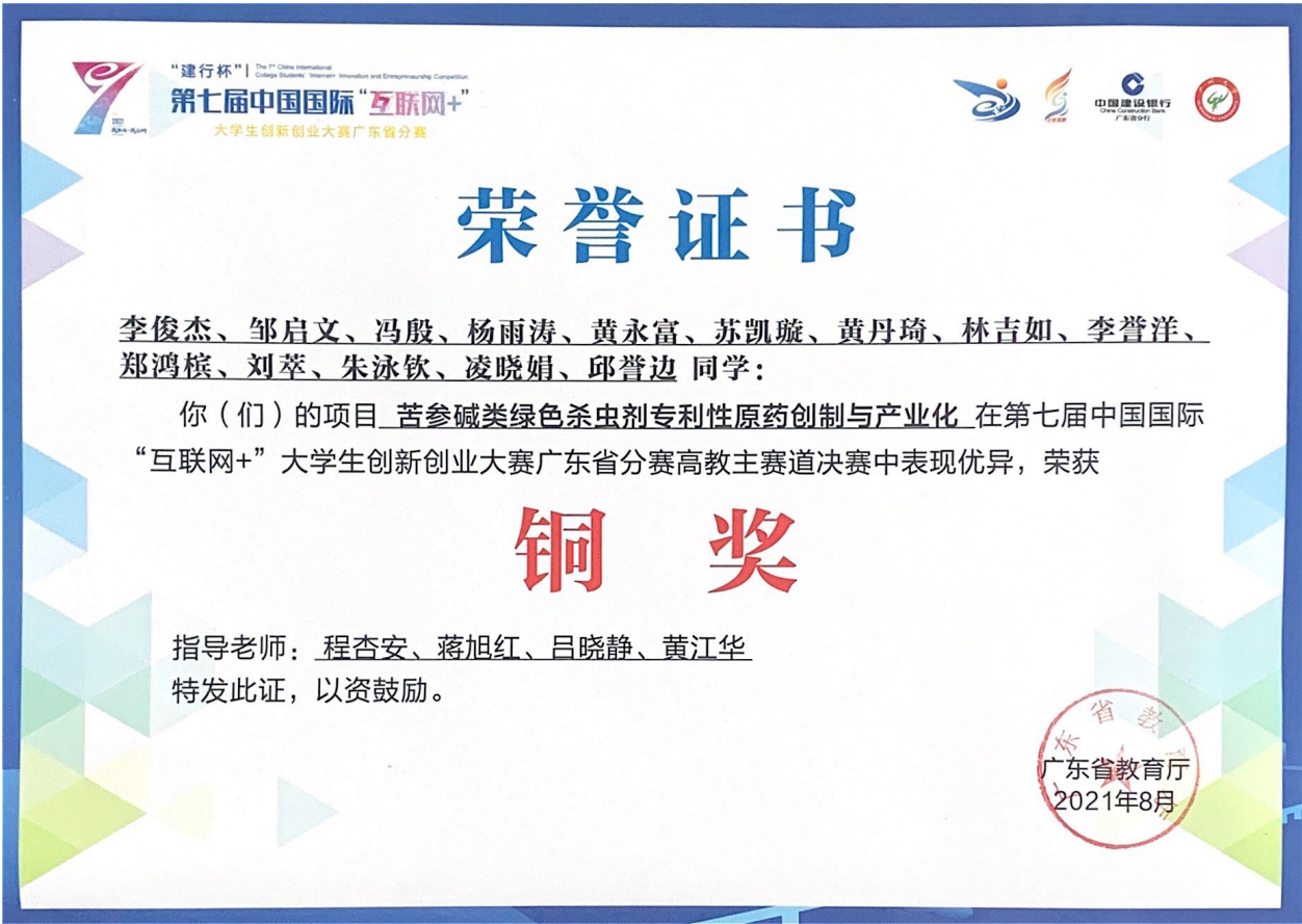 [2021.08]第七届“互联网+”广东省高校主赛道铜奖-苦参碱类绿色杀虫剂专利性原药创制与产业化-李俊杰 邹启文 冯殷(指导老师:程杏安 蒋旭红 吕晓静 黄江华).png