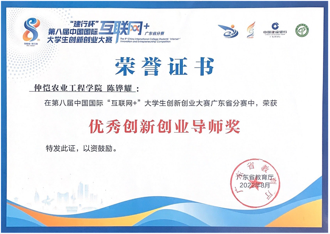 [2022.08]第八届“互联网+”广东省高校主赛道优秀创新创业导师奖-陈铧耀